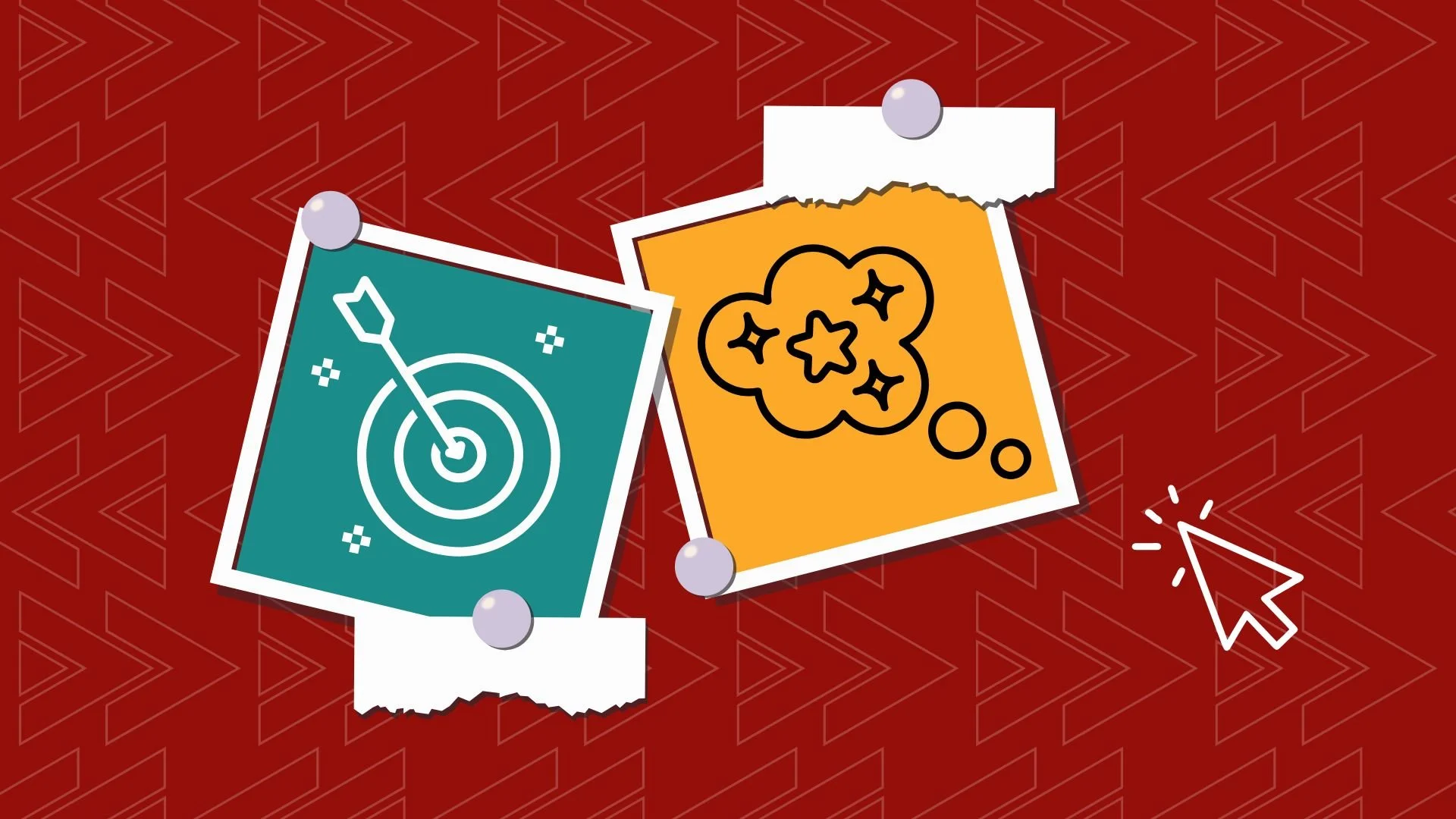 [ID: Over a red background with alternating arrows, two pinned post it notes in yellow and teal. One has a bullseye, and the other has a thought bubble with sparkles, signifying goals and visioning. To the right side, an arrow cursor clicking.]